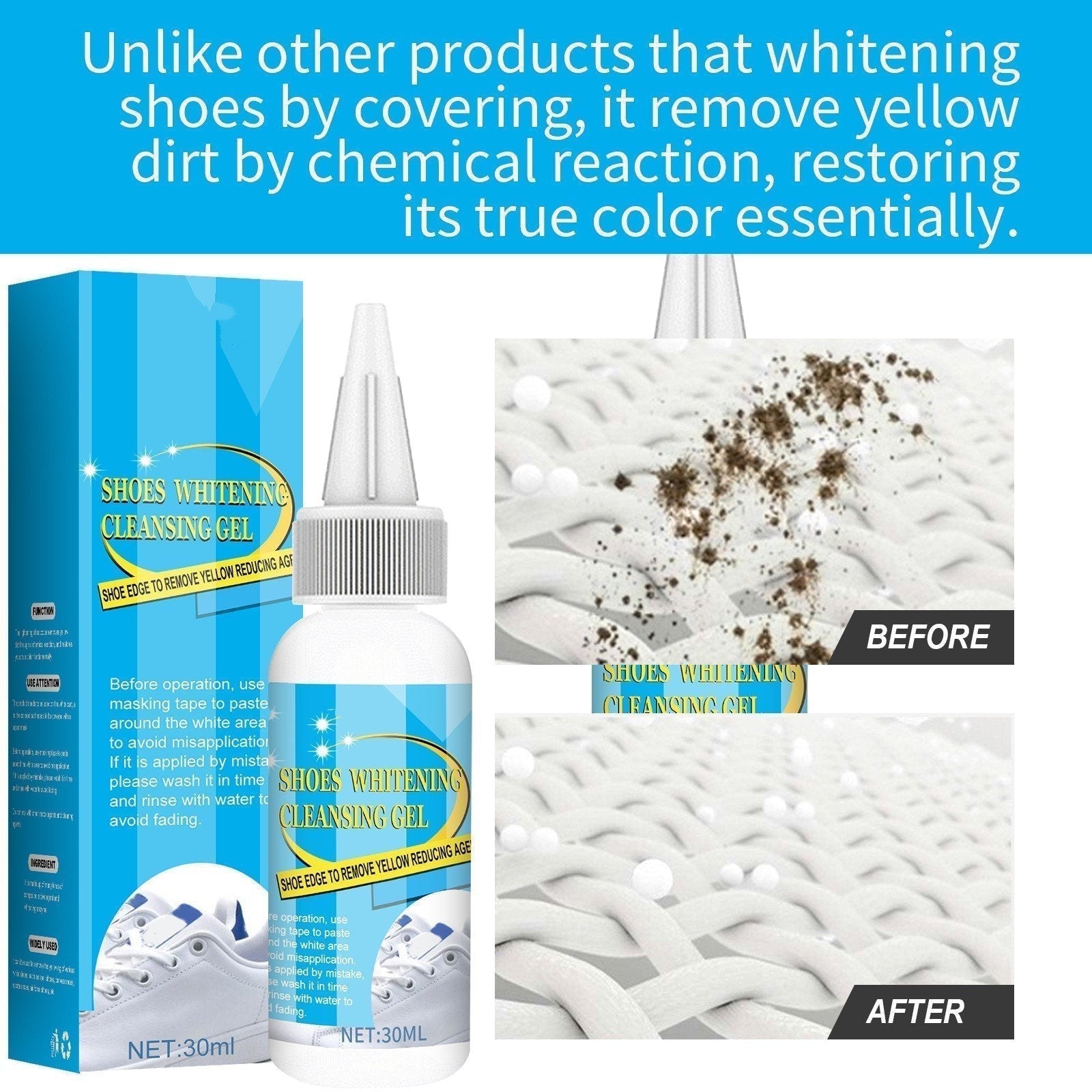 Till skillnad frÄn andra produkter som bleker skor genom att tÀcka, tar den bort gul smuts genom kemisk reaktion och ÄterstÀller i huvudsak dess sanna fÀrg.