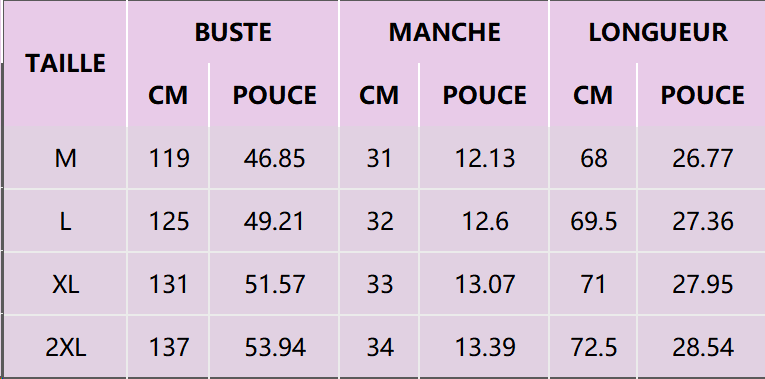| SIZE (INCH) | BUST | SLEEVE | LENGTH |
